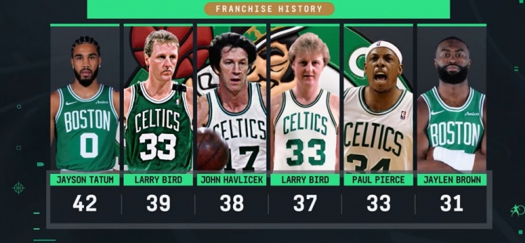 绿军球员单赛+场次:塔图次第一 布次紧追皮尔斯